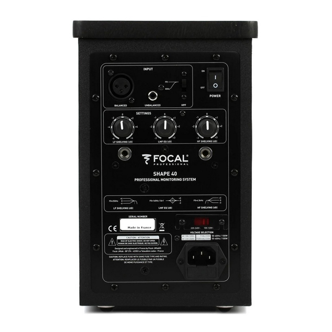 اسپیکر مانیتورینگ استودیویی فوکال مدل Shape 40 از اسپیکر های ساخته شده به دست کمپانی فرانسوی فوکال Focal می باشد. اندازه ووفر این اسپیکر 4 اینچ بوده و مجموع توان خروجی آن 50 وات می باشد. همچنین حداکثر میزان فشار صوتی این اسپیکر 102 دسی بل در محدوده پاسخ فرکانسی 60 هرتز تا 35000 هرتز می باشد.